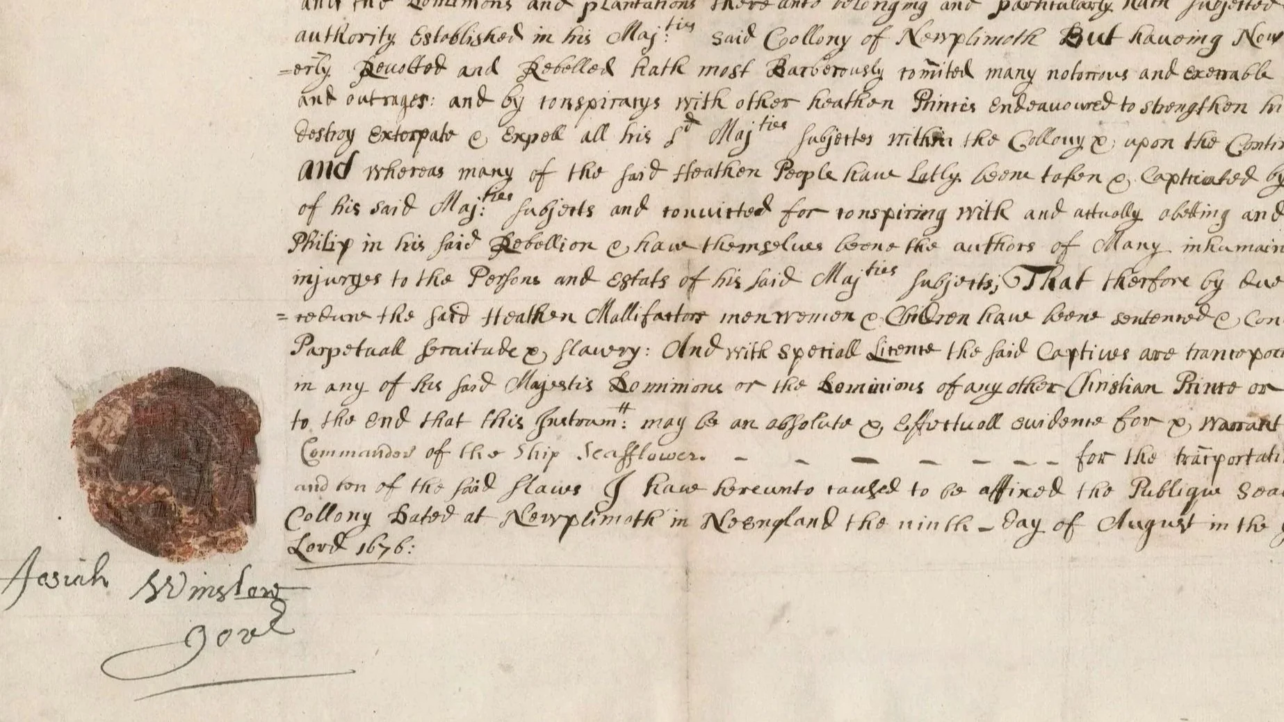 This certificate from Plymouth colony governor Josiah Winslow granted Captain Thomas Smith of the Seaflower the right to transport 110 Native men, women, and children out of Plymouth and to sell them into "perpetuall servitude & slavery." Dated August 9, 1676. Certificate to Thomas Smith, 9 August 1676, Josiah Winslow, 1676. Collections of the Massachusetts Historical Society, Boston